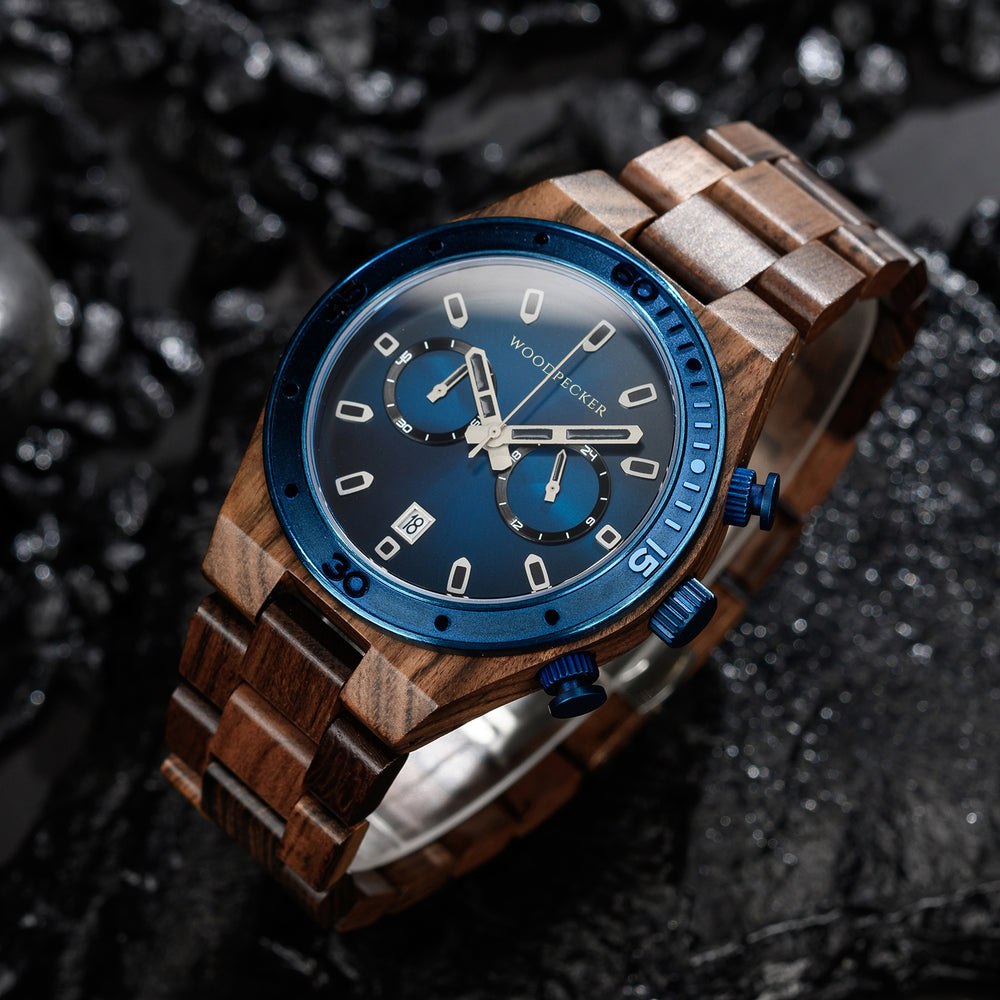 De Savoy verenigt precisie met natuurlijke schoonheid. Dit chronograaf horloge, gemaakt van select walnoothout, biedt zowel functionaliteit als stijl. De opvallende blauwe wijzerplaat met twee subdials maakt elk horloge uniek, terwijl de chronograaf functies zorgen voor praktisch gebruik.