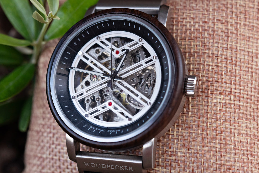 Aangedreven door een verfijnd automatisch uurwerk werkt het Solstice horloge op jouw energie, waardoor batterijen overbodig worden en naadloze precisie wordt geleverd. De combinatie van hoogwaardige materialen, waaronder een stevige zilveren kast en natuurlijke houttinten, creëert een perfecte balans tussen moderniteit en klassieke charme.